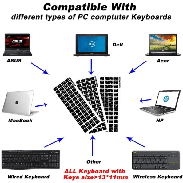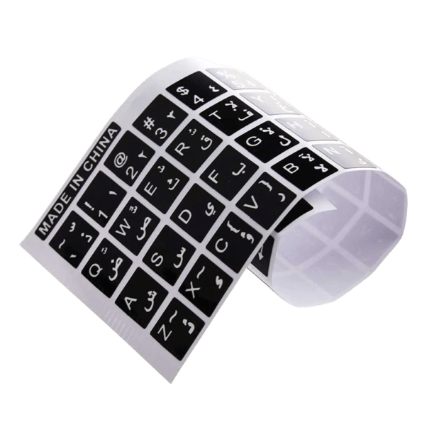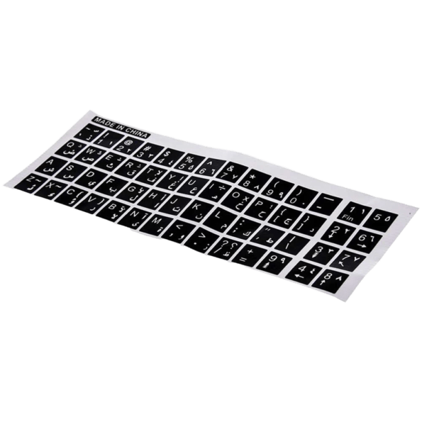 ستيكر كيبورد عالي الجودة باللون الأسود، يُستخدم لتعديل لوحة المفاتيح وتحويلها لتكون متوافقة مع اللغتين العربية والإنجليزية. سهل الالتصاق والثبات.