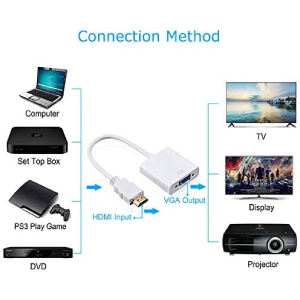 يمكن لمحول اتش دي ام اي الذكر إلى في جي ايه الأنثى نقل الفيديو من جهاز متوافق مع اتش دي ام اي مثل اللابتوب ووحدة المعالجة المركزية وما إلى ذلك إلى شاشة أو جهاز عرض بمنفذ في جي ايه. يتطلب كابل في جي ايه (يُباع بشكل منفصل). |